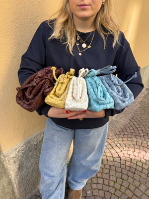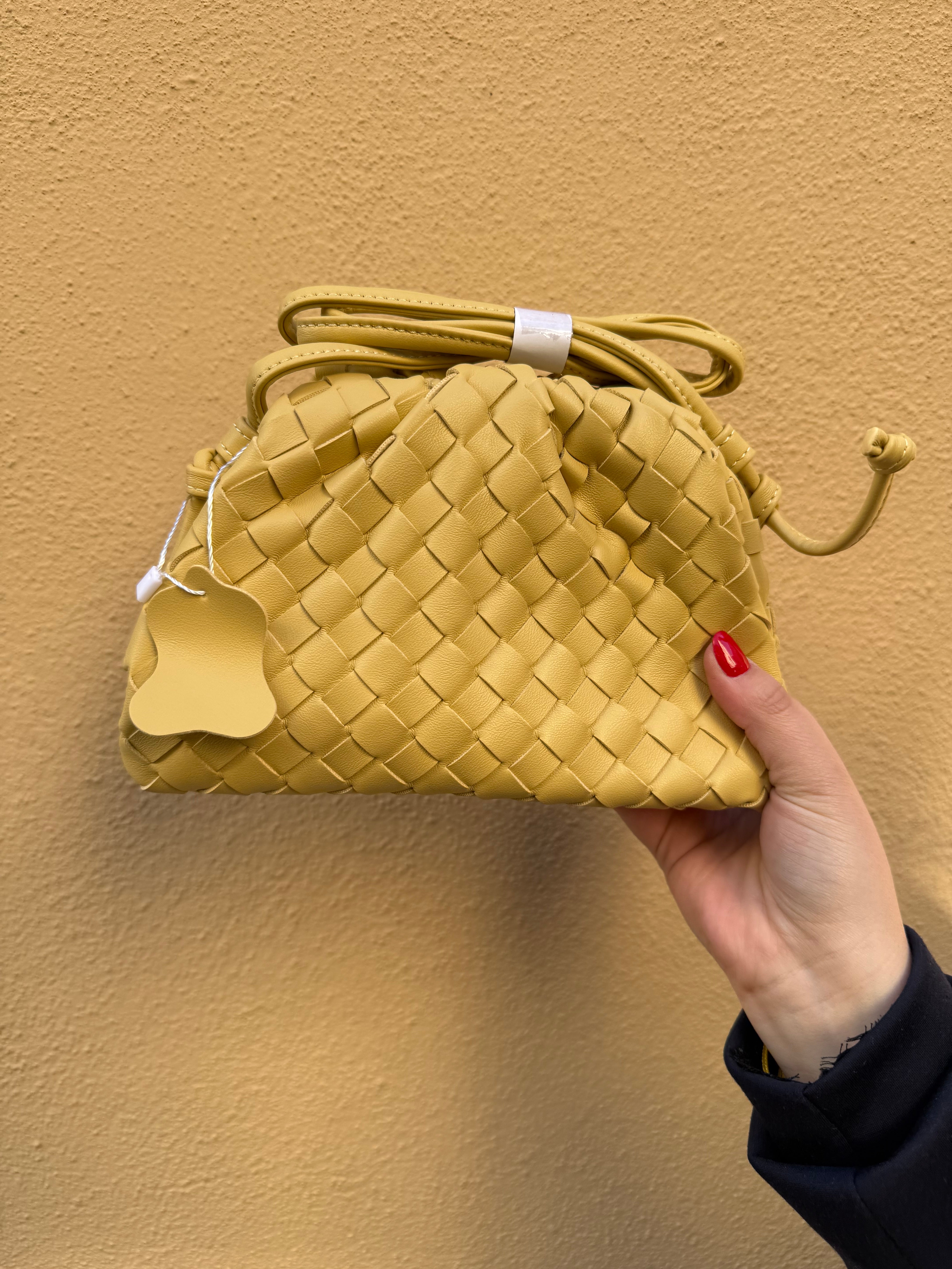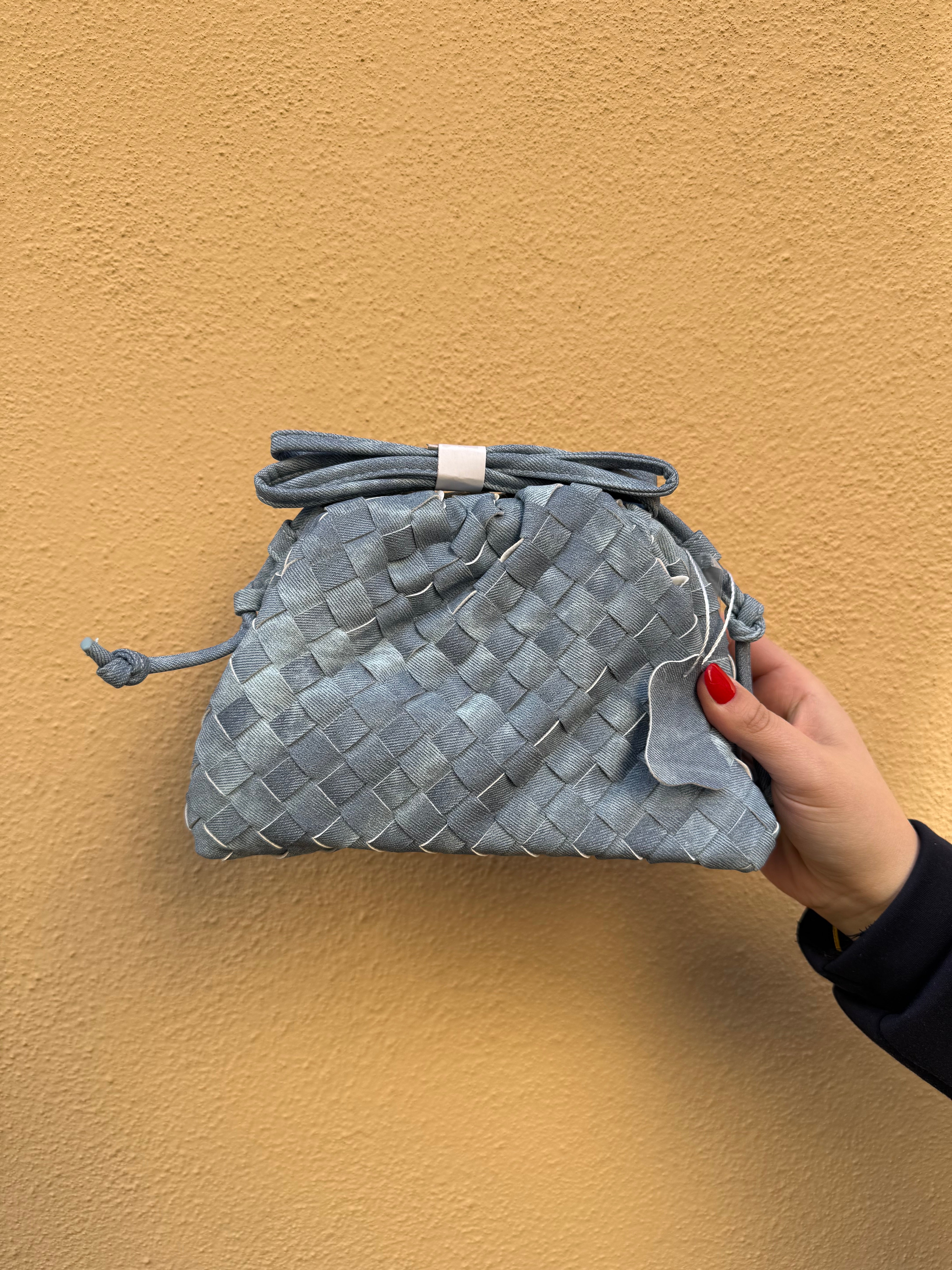 Borsa intrecciata. Con chiusura a calamita. Dotata di tracolla.